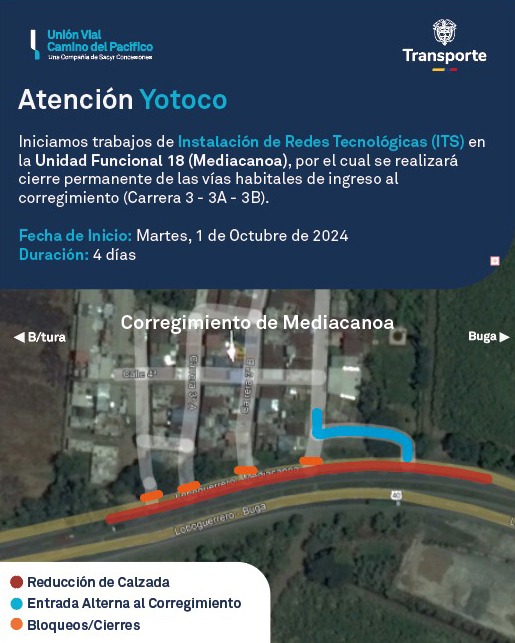 La Concesionaria Unión Vial Camino del Pacífico se permite informar que inicia trabajos de construcción en la Unidad Funcional 18 (Mediacanoa), con la instalación de Redes Tecnológicas (ITS), en la calzada derecha (Sentido Buga-Buenaventura).